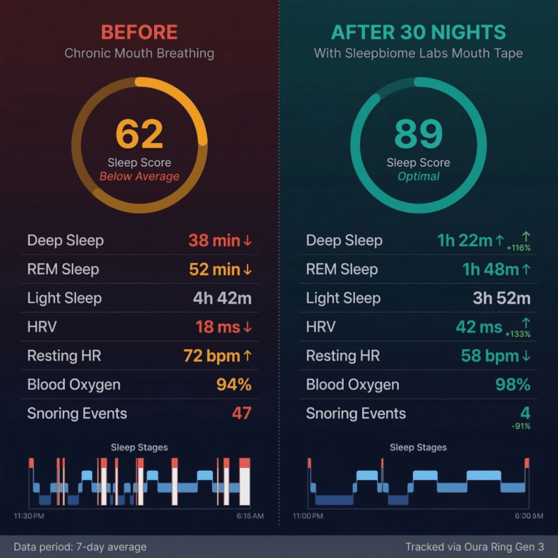 “My Oura deep sleep went from 38 minutes to 1 hour 22 minutes in the first week. HRV up 15 points. This $0.60/night strip outperformed thousands of dollars in supplements.”