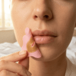 Center the strip over your closed lips — the gold hydrogel patch sits directly over your lips for all-night moisturizing. The breathing vent should be in the middle.